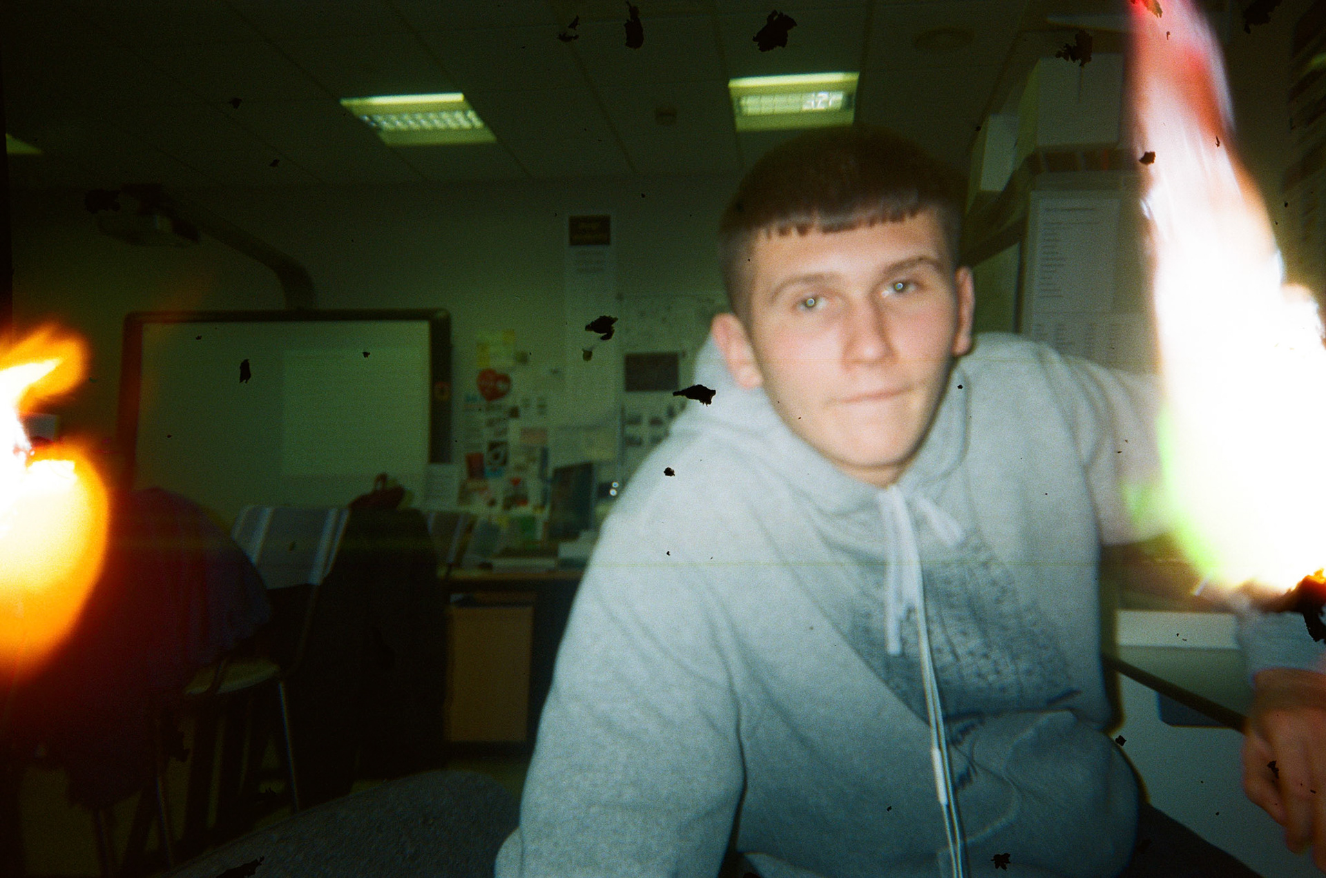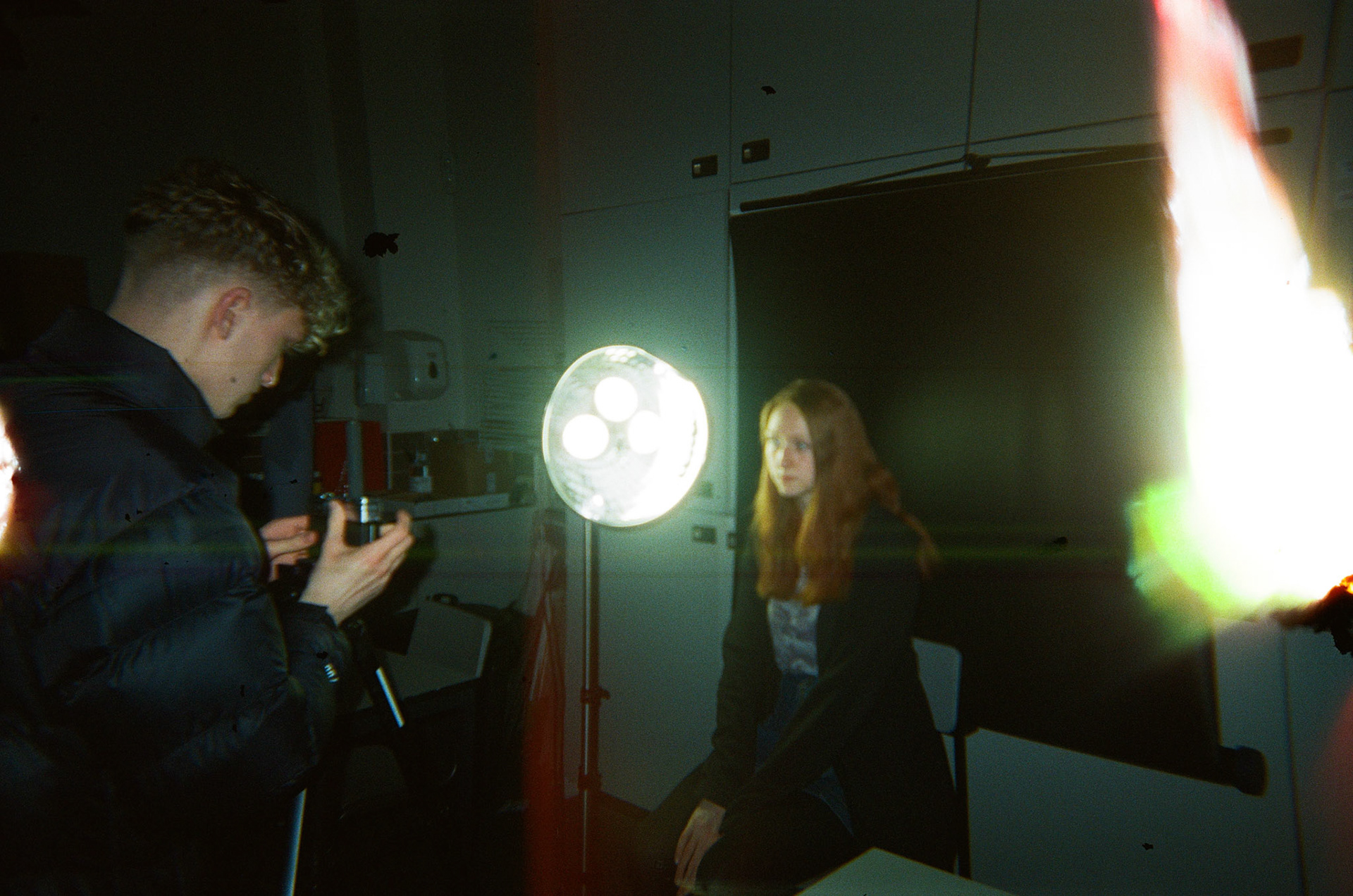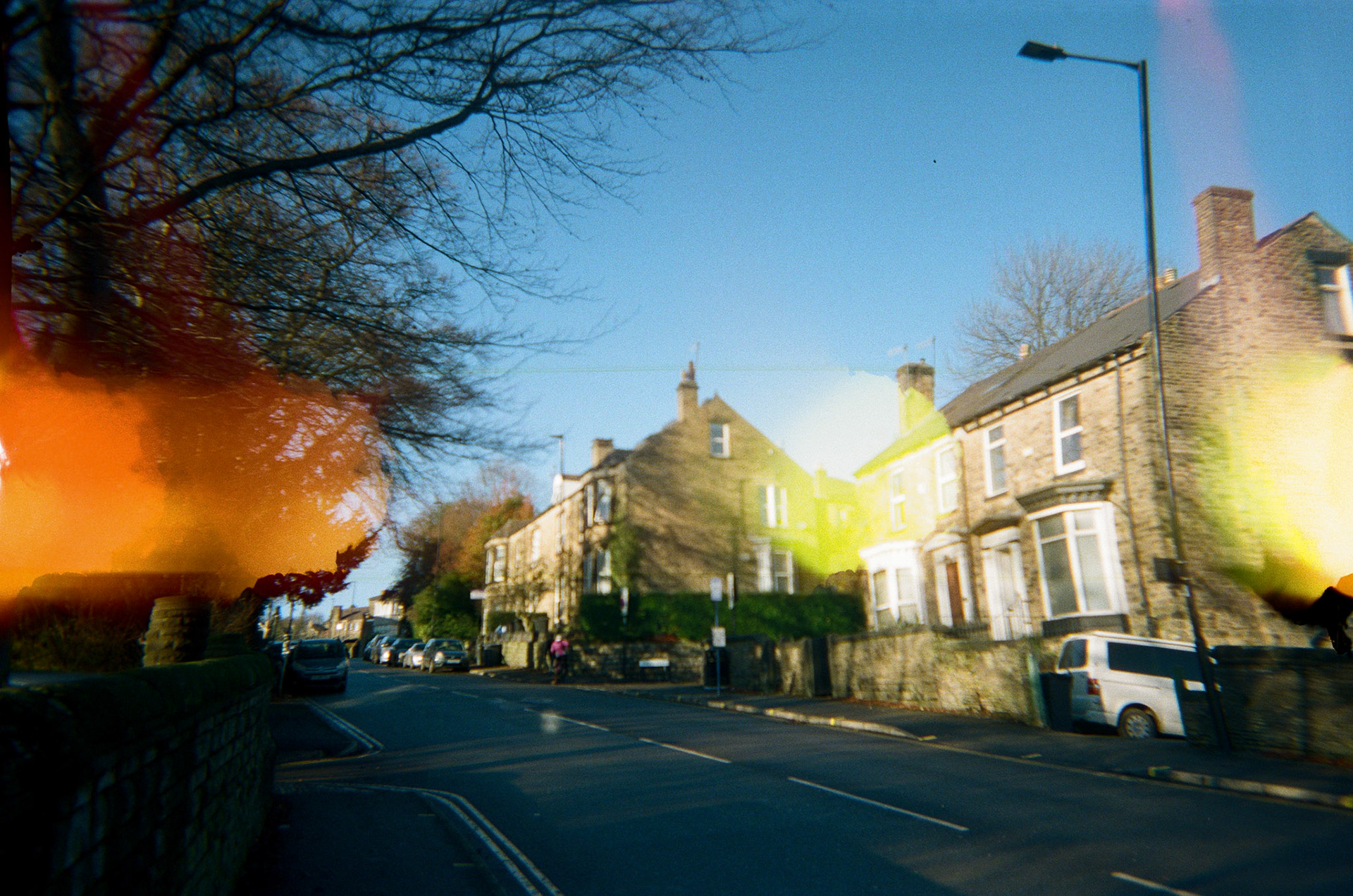 I drilled into the back of a Kodak FunSaver 800 to achieve light leaks on every frame of the film. I taped the hole so I could cover and uncover whenever I chose. The negatives had an even spread of light leaks and film errors. I would've liked the light leaks to have more colour, meaning I should have exposed the film less.