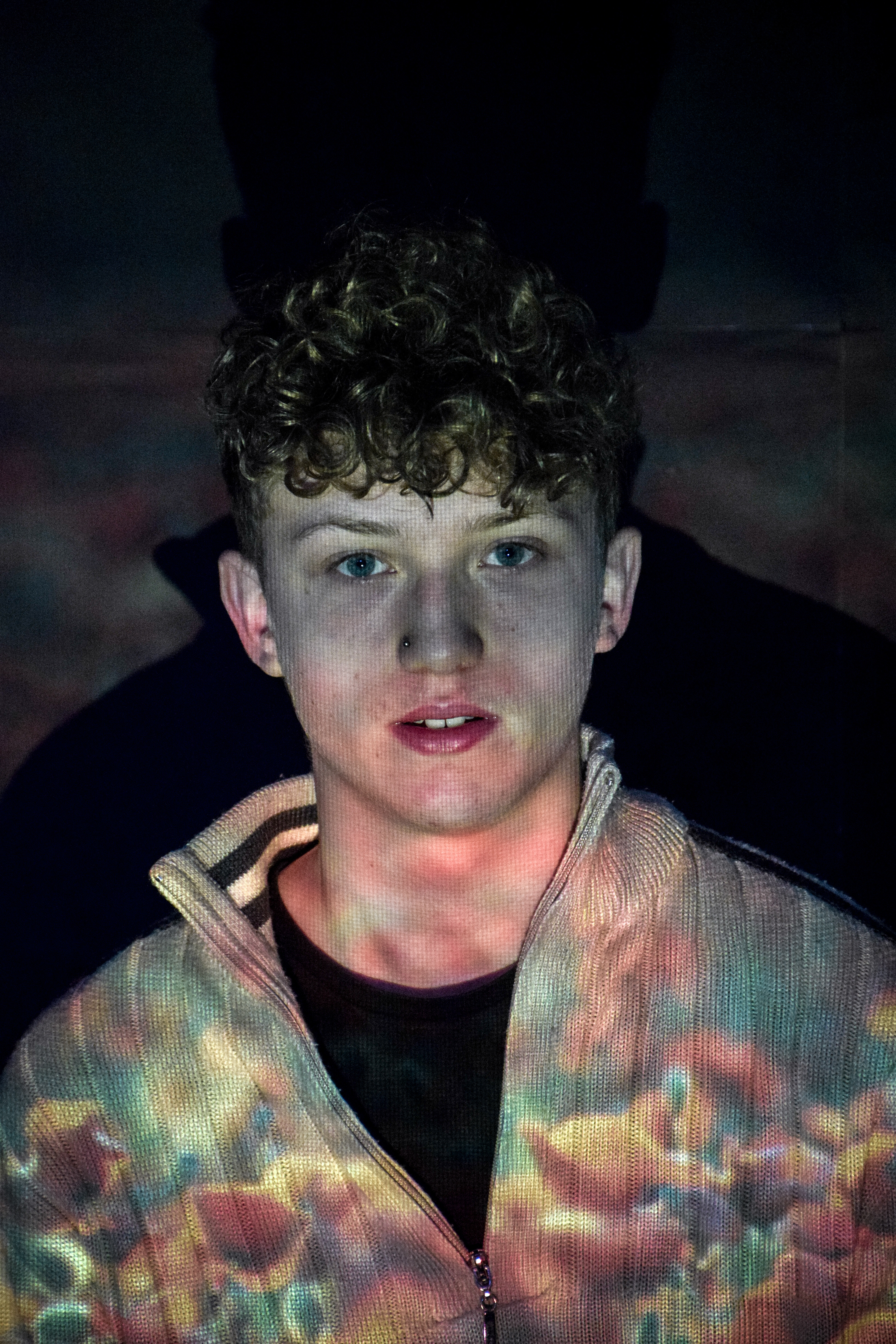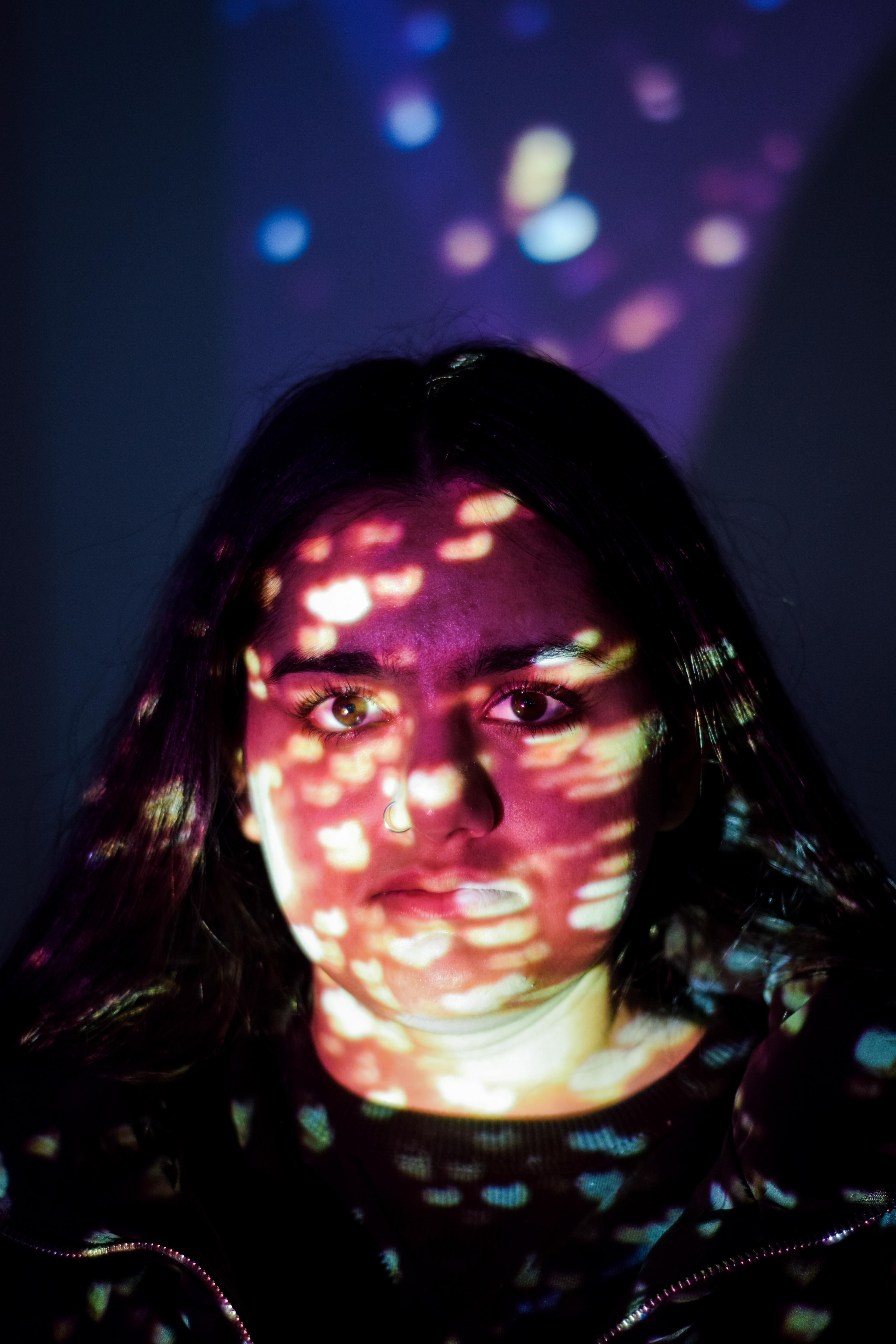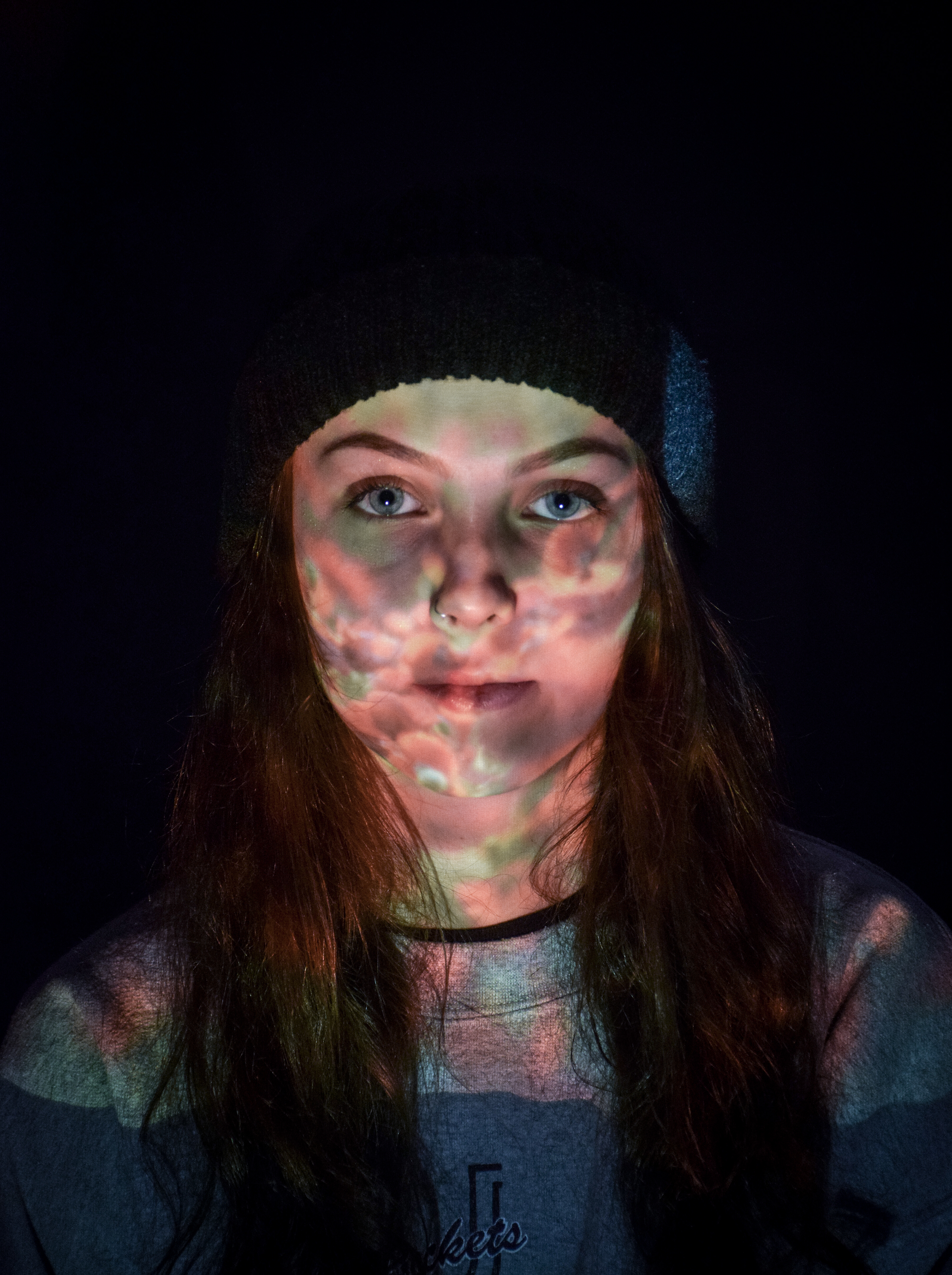 We projected several different images onto faces and used a Nikon D3300 DSLR to photograph the results. We changed white balance, shutter speed etc. to achieve different results. We edited the images in Lightroom CC.